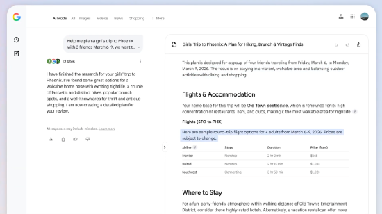 谷歌在一篇博客文章中解释道:“选择后,‘画布’侧边栏会立即生成一份旅行计划,其中整合了航班和酒店的实时搜索数据、谷歌地图中的详细信息(如照片和评价),以及来自全球各类网站的相关内容。你会看到符合个人需求的推荐,例如基于价格和设施的酒店对比,或是根据住宿地点的出行时间优化后的餐厅及活动建议。”