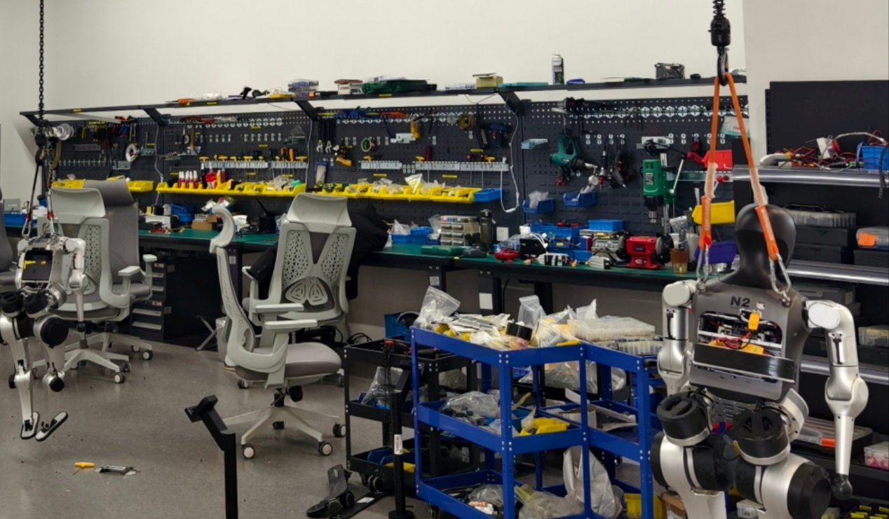 为应对不同硬件装配需求,松延动力的实验室就像一座“机器人修理厂”,螺丝、电机等零部件按型号分门别类摆在工作间里,多达上百种;维修工具挂满了一面10米的墙壁,仅扳手有近20种。