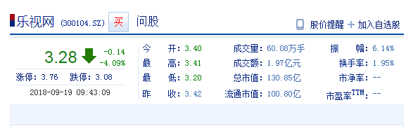 新浪科技讯 9月19日上午消息,乐视网(300104.SZ)开盘微跌0.58%,报3.4元/股,随后迅速走低,截止9点43分,乐视网跌幅超4%,报3.28元/股。