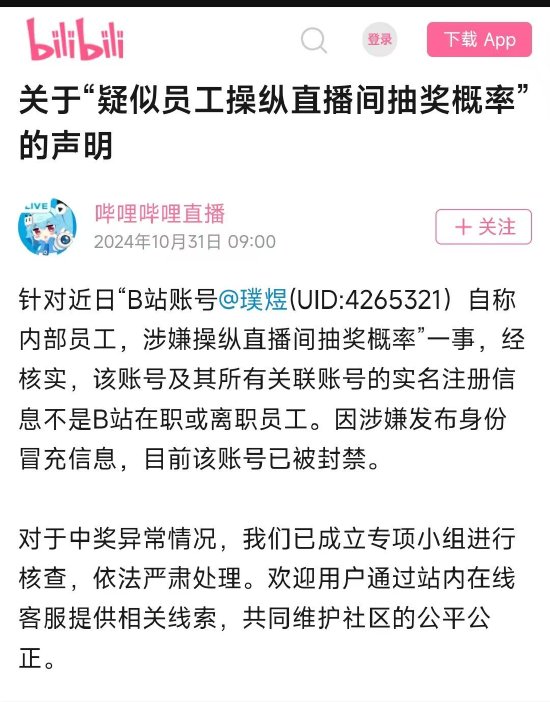 针对近日“B站账号@璞煜(UID:4265321)自称内部员工,涉嫌操纵直播间抽奖概率”一事,经核实,该账号及其所有关联账号的实名注册信息不是B站在职或离职员工。因涉嫌发布身份冒充信息,目前该账号已被封禁。