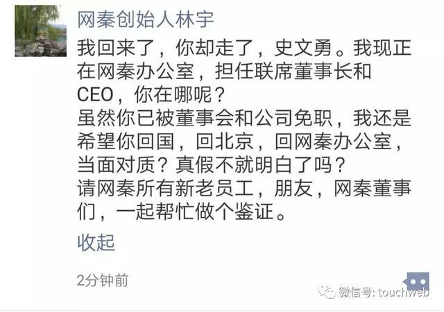 “虽然你已被董事会和公司免职,我还是希望你回国,回北京,回网秦办公室,当面对质?真假不就明白了吗?”
